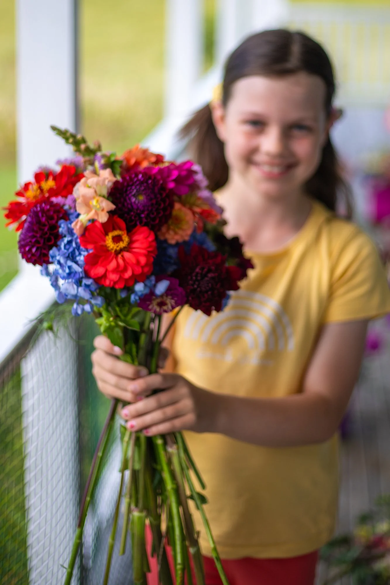 I have a merry little band of helpers, ages 10, 7 and 4 that love to assist with harvesting, foliage stripping, seed sowing, photography and supplying me with rubber bands. We love to be outdoors and in nature, working with our beautiful flowers.